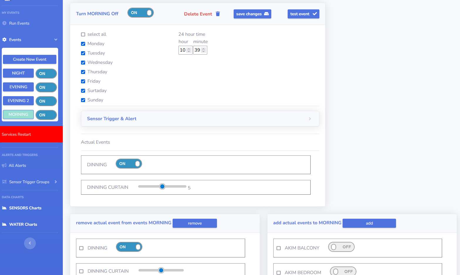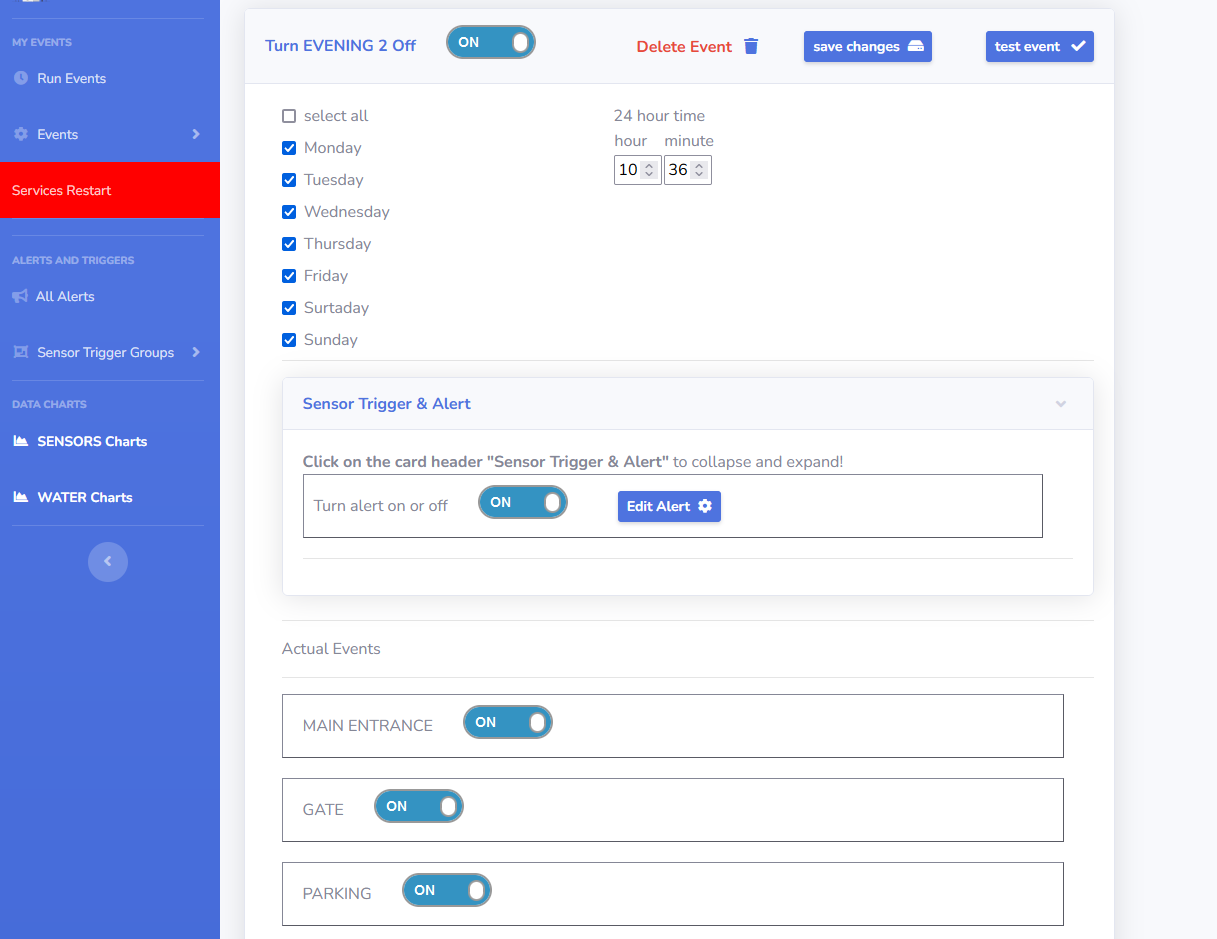 A grouped set of actions can be set to run at a specified time and day of the week i.e. turn off all lights and water pumps every day at 10.00 P.M.